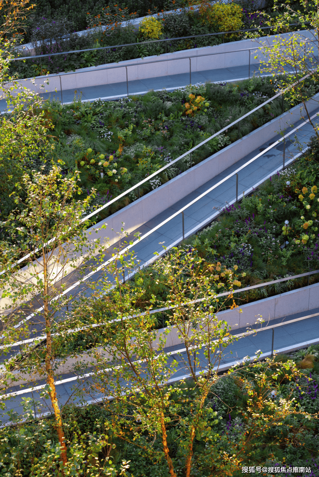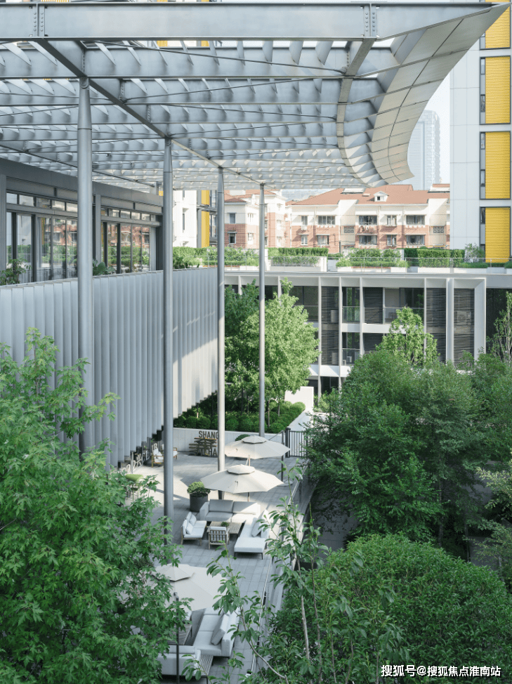 从一层大堂到约9。45m标高的高线公园、屋顶花圃等一系列空间融合,创制了立体的社交糊口场景。