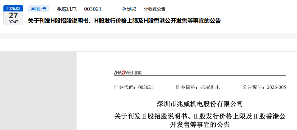 深圳市兆威机电股份无限公司(以下简称“公司”)正正在进行申请刊行境外上市外资股(H股)并正在结合买卖所无限公司(以下简称“联交所”)从板挂牌上市(以下简称“本次刊行并上市”)的相关工做。2025年6月18日,公司向联交所递交了本次刊行并上市的申请,并于同日正在联交所网坐登载了本次刊行并上市的申请材料;按照本次刊行并上市打算并按照联交所的相关,公司于2025年12月19日向联交所更新递交了本次刊行并上市的申请,并于同日正在联交所网坐登载了更新申请材料。具体内容详见公司别离于2025年6月19日、2025年12月22日正在巨潮资讯网()披露的《关于向联交所递交境外上市外资股(H股)刊行上市的申请并刊发申请材料的通知布告》(通知布告编号:2025-036)、《关于刊行H股并上市的进展通知布告》(通知布告编号:2025-058)。2025年11月21日,公司收到了中国证券监视办理委员会(以下简称“中国证监会”)就公司本次刊行并上市出具的《关于深圳市兆威机电股份无限公司境外刊行上市存案通知书》(国合函[2025]2074号)。具体内容详见公司于2025年11月24日正在巨潮资讯网()披露的《关于刊行境外上市外资股(H股)获得中国证监会存案的通知布告》(通知布告编号:2025-053)。2026年1月30日,公司正在联交所网坐登载了本次刊行并上市聆讯后材料集。具体内容详见公司于2026年1月31日正在巨潮资讯网()披露的《关于刊发H股刊行聆讯后材料集的通知布告》(通知布告编号:2026-004)。公司按照相关正在联交所网坐登载了本次刊行上市H股招股仿单,该H股招股仿单为按照合用的法令律例和联交所、证券及期货事务监察委员会的相关规范及要求而刊发,其包含的部门内容可能取公司先前按照律例预备或者刊发的相关文件存正在必然的差别,包罗但不限于该招股仿单中包含的按照国际会计原则编制的会计师演讲,刊发目标仅为供给资讯予人士和合伙历的投资者,境内投资者该当公司正在境内的及监管机构指定的消息披露网坐的相关消息和通知布告。鉴于本次刊行上市H股招股仿单的刊发目标仅为供给消息予人士和合伙历的投资者,公司将不会正在境内证券买卖所的网坐和合适监管机构前提的上登载该H股招股仿单,但为使境内投资者及时领会该H股招股仿单披露的本次境外刊行上市及公司的其他相关消息,现供给该H股招股仿单正在联交所网坐的查询链接供查阅:需要出格予以申明的是,本通知布告仅为境内投资者及时领会本次刊行并上市的相关消息而做出。本通知布告以及公司登载于联交所网坐的H股招股仿单均不形成也不得视做对任何小我或实体收购、采办或认购公司任何证券的要约或要约邀请。公司本次全球发售H股根本刊行股数为26,748,300股,此中,初步放置公开辟售2,674,900股(可予从头分派),约占全球发售总数的10。00%;国际发售24,073,400股(可予从头分派),约占全球发售总数的90。00%。公司本次H股刊行的价钱最高不跨越每股73。68港元,公司H股公开辟售于2026年2月27日起头,估计于2026年3月4日竣事,并估计于2026年3月6日前(含当日)发布刊行价钱,相关环境将登载于联交所网坐()和公司网坐()。